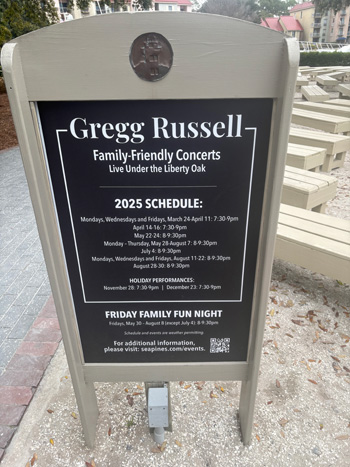 Gregg Russell has been writing and performing great music for over 40 years. His credits include literally hundreds of children's songs, writing and performing original music for TV specials and more. He's best known for his evening performances under the old Liberty tree in Harbour Town where he has delighted over 3 million fans, young and old alike for over 40 seasons.